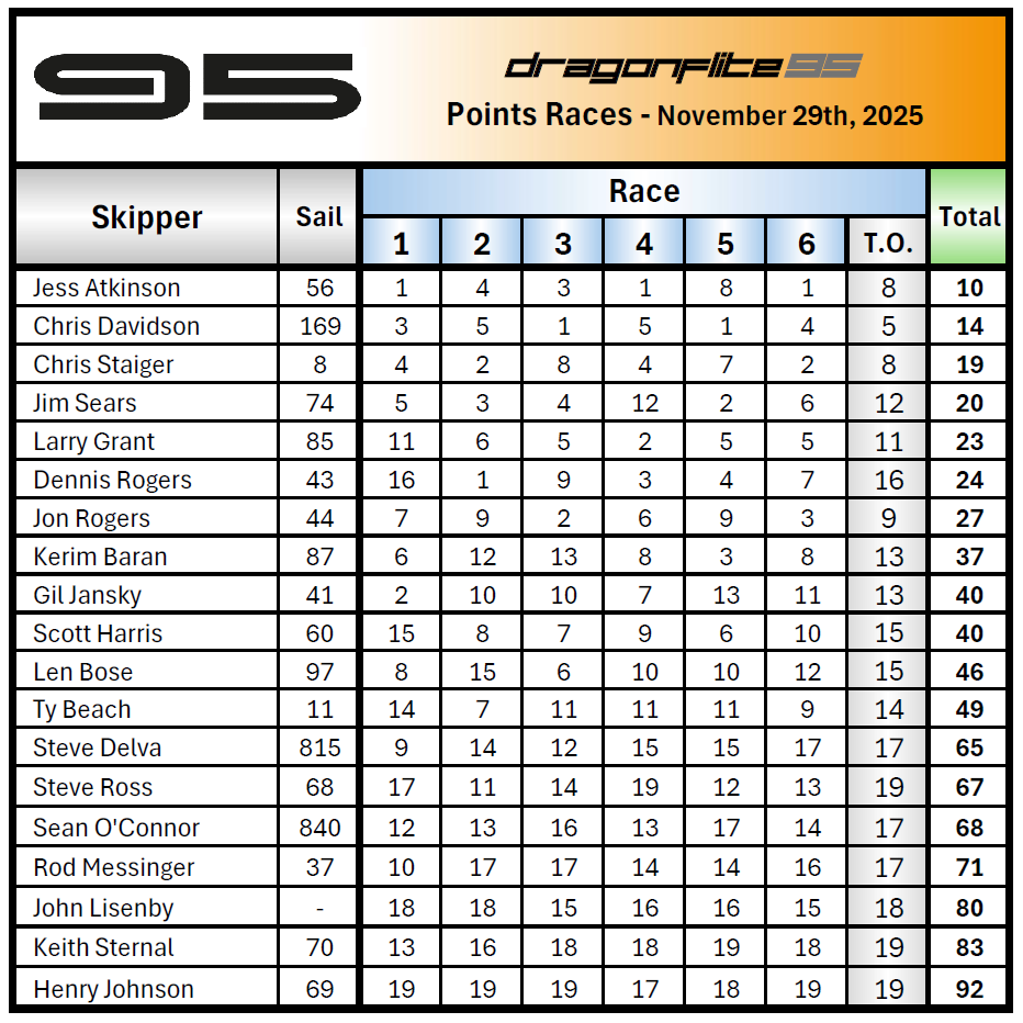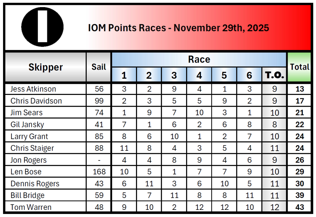 We had a good day of sailing with both classes completing 6 races each. Special thanks to our two ad hoc RD’s, Tom Warren and Kerim Baran. We could not play this game without you! Also thanks to Jess Atkinson, Chris Davidson and Bill Bridge for setting courses and clean-up.