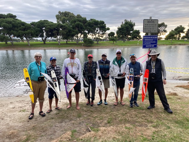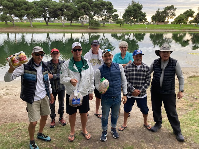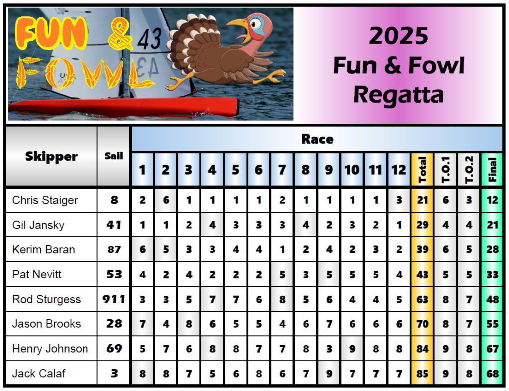 Len Bose and Doc Elliott were trapped in Orange County due to the closure of I-5, so there were 8 competitors for the 2025 Fun & Fowl Regatta. Saturday began drizzly, cold and windless, but a sizeable Peanut Gallery gathered to witness the spectacle. After a ‘waiting for the wind’ delay, PRO Ben Reeve called the first race; a short course drifter that seemed much longer than it took. After a race or two, a light breeze from the northwest began to fill in a bit and Ben tried some medium courses. Eventually, the fingery breeze freshened and became almost due west, so Ben ran a Looong course. The temperatures rose and a bit of sunshine peeked through the clouds as the breeze slackened a bit but remained pretty smooth with only minor to moderate shifts.