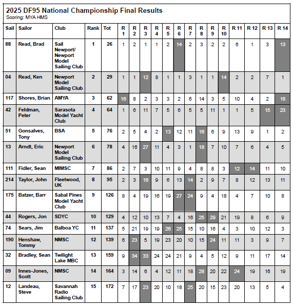 Racing off the Sail Newport Sailing Center in Brenton Cove, the fleet battled through 14 races in steady, building winds, with tight starts and finishes throughout. The regatta came down to an intense duel between brothers Brad and Ken Read, both world-class sailors, with Brad’s consistent, conservative approach on the final day earning him the national title by three points. The event showcased just how serious—and skill-sharpening—RC sailing can be, and left competitors eager to return to Newport for future regattas.